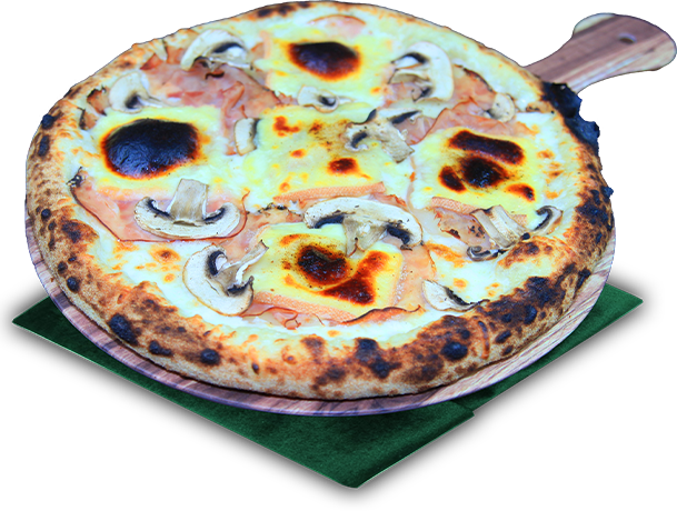 Sauce tomate, mozzarella, jambon de dinde, champignons frais